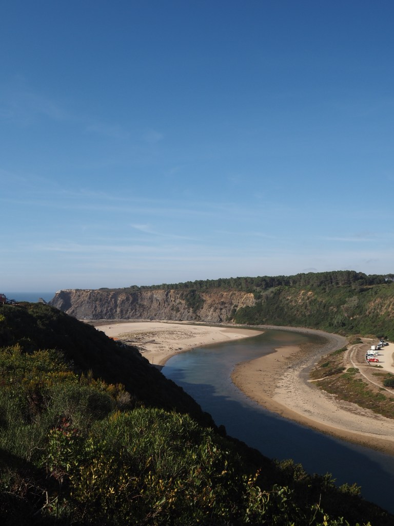 Hier trifft der Fluss Ribeira de Seixe auf das Meer, Süßwasser und Salzwasser verschmelzen, eingerahmt von Dünen und Felsen.